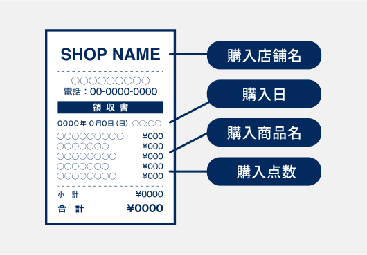 レシートは購入店舗名、購入日、購入商品名、購入点数がはっきり写るようにしてください。